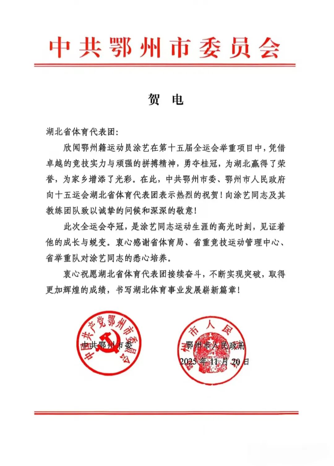 鄂州市委、市政府向湖北省体育代表团致贺信